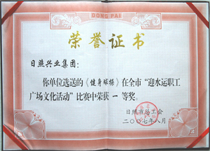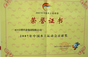 ·2007年9月,中國水上運動會組委會授予日照興業(yè)集團有限公司“中國水上運動會貢獻獎”