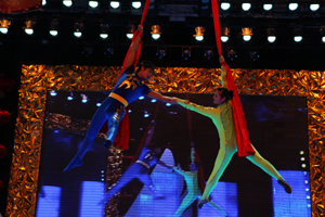 整場晚會以興業(yè)集團成立10周年走過的光輝歲月為主線,在興發(fā)公司選送的歌伴舞《吉祥頌》中拉開了帷幕,伴隨著激越的鼓點、歡快的舞蹈、喜悅的歌聲,霎時,千米演播大廳成為了歡樂的海洋。興業(yè)房產(chǎn)公司選送的歌舞《紅旗飄飄》、《愚公移山》,唱出了興業(yè)人對偉大祖國的熱愛和百折不撓的創(chuàng)業(yè)精神;興業(yè)汽配公司選送的《前門情思大碗茶》京味十足,集團機關選送的原生態(tài)陜北民歌《山丹丹花開紅艷艷》和青春奔放的流行歌曲《改變自己》,展現(xiàn)了興業(yè)人多才多藝的時代風采;天泰鋼構公司田雯雯一曲《美麗心情》抒發(fā)了興業(yè)人對美好生活的熱愛和追求;房產(chǎn)公司姑娘們表演的富有濃郁民族特色的新疆舞《西域風情》,勾起觀眾對邊疆風情的片片遐想。集團機關創(chuàng)作的配樂詩朗誦《興業(yè)十年頌》和音樂群口快板《說唱興業(yè)房產(chǎn)》,讓全場觀眾打開記憶之門,重溫了興業(yè)集團10年的發(fā)展歷程,更是喚醒了興業(yè)人強烈的歷史使命感和自豪感,迸發(fā)出一股強大的自我升華的豪邁激情。青島永杰的姑娘們帶來的《激情水鼓》,奏響迎春盛典,震耳欲聾的鼓聲配合激昂的音樂,水花飛濺,光芒四射,引爆全場激情。友誼商店的姑娘們表演的運動時裝秀和社區(qū)老年人表演的太極功夫扇《夕陽美》,活力十足的青春魅力與剛柔并濟的白發(fā)矍鑠,演繹出了一幅興業(yè)大家庭的和諧美景。公司選送的小品《風波》和興發(fā)公司選送的山東快書《大老郭趕春晚》,情趣交融,令人捧腹,反映出了當代建筑工人的情感世界和興業(yè)人對企業(yè)的無限熱愛之情。雜技《夢幻藍綢》驚險刺激,動人心魄,引起場下觀眾陣陣驚呼。當全場觀眾期待已久的北京《OOB美少女組合驚艷亮相時,場下掌聲雷動,歡呼一片,動感十足的青春美少女用她們的成名作《地球媽媽》和一首《心想事成》,甜歌勁舞,征服了全場觀眾,再掀晚會新高潮。“山一樣的氣魄,海一樣的魂,春天里走來了興業(yè)人”,伴隨著晚會主題歌曲《興業(yè)春天》的響起,《興業(yè)春天》興業(yè)集團2010年春節(jié)聯(lián)歡晚會華彩落幕。